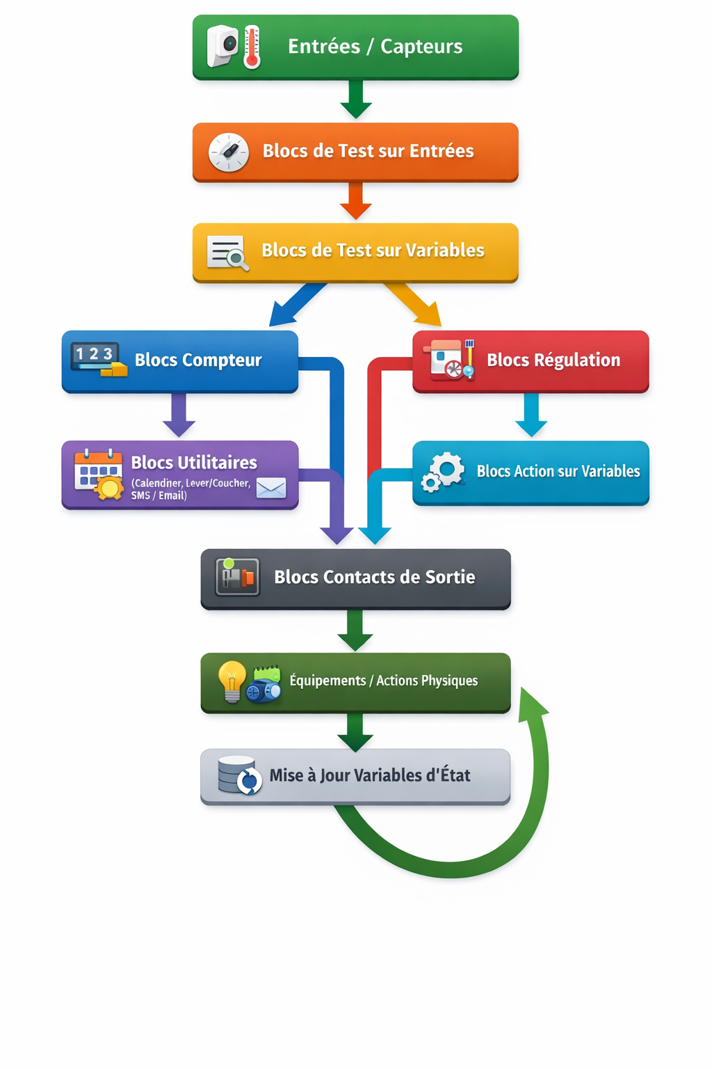 Chaque bloc remplit une fonction logique précise dans le traitement des entrées, des variables et des sorties.